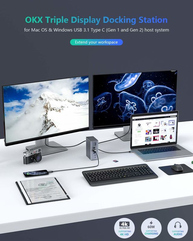 ডিসপ্লেলিঙ্ক ডকিং স্টেশন 120W পাওয়ার অ্যাডাপ্টারের সাথে ট্রিপল মনিটর, ম্যাকবুকের জন্য ট্রিপল 4K ডিসপ্লে
